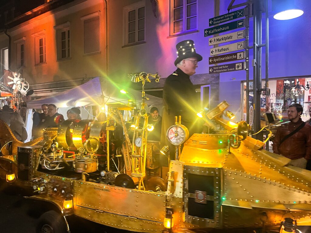 Das war eine geniale Idee der engagierten Agentur, Funkelglanz Events, die Stadt Remagen davon zu überzeugen, ihr Lichtfest mit Kunst- und Dampfmaschinen und deren Fans, den Steampunkern, ein wenig aufzuhübschen. Die Einheimischen fanden es spannend diese skurrilen, gut gelaunten Freaks zu sehen. Nebenbei konnten sie auch noch ein bisschen shoppen und einen über den Durst trinken, und die „Freaks“ hatten großen Spaß in der kleinen Stadt am Rhein, Gleichgesinnte zu treffen.